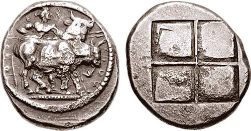 | BMC 1 | Thraco-Macedonian Tribes, The Orreskioi AR Oktadrachm. Circa 479-465 BC. OΡΡ-E-Σ-KION (Σ & N retrograde), herdsman, holding two spears, guiding two bulls, one with head reverted, right upon dotted groundline; flower to right / Quadripartite incuse square. AMNG III 2.