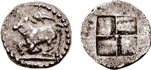 | BMC 2v | Thraco-Macedonian Tribes, The Orreskioi AR Diobol. Circa 479-465 BC. Bull standing left; above, dolphin left / Quadripartite incuse square. AMNG III 7.