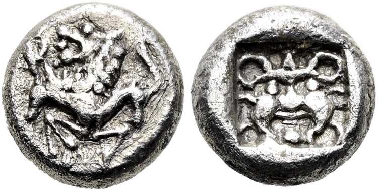 | wwxls AR13173 | Zeleia, Troas, AR hemidrachm, 550-500 BC. 11 mm, 2.12 g. Forepart of lion or chimaera right, stag's head left to left. / Head of gorgoneion with protruding tongue, in square incuse. Unpublished. wwxls AR13173; Heritage 61415, 22113. | Text | Image |
