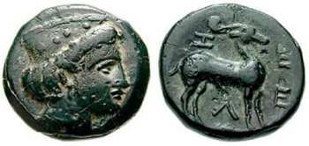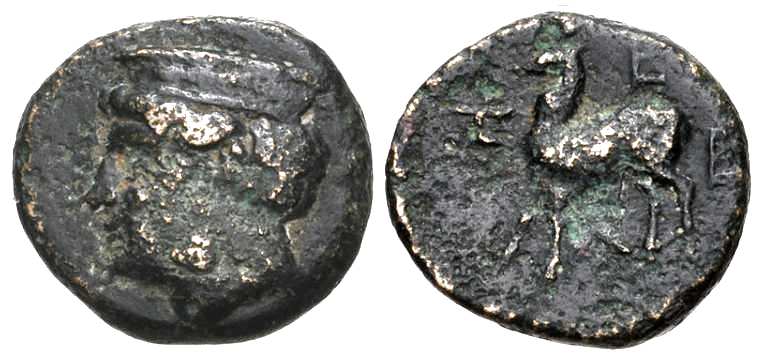 | wwxls BC10108 | Zeleia, Troas, 400-300 BC. AE 11 mm, 1.61 g. Head of Artemis left, wearing stephane / Z-E-Λ-E, stag standing left. wwxls BC10108; CNG 253, lot 107. Unpublished with Artemis and stag left. | Text | Image |