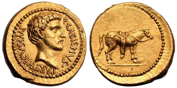 | BMCRR 131 | Quintus Labienus AV Aureus. 42-39 BC. Travelling military mint, early 40 BC. 20mm, 8.09 g. Q•LABIENVS•PARTHICVS•IMP, bare head right / Horse standing right on ground line, wearing saddle with quiver and bridle. Crawford 524/1; BMCRR East 131. | Text | Image |