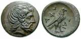 | 6144 | Head of Apollo Carneius right with horn of Ammon, long hair, later style. Two eagles face to face, ivy leaf between them, vine and AAΦY in field. 15 mm. |