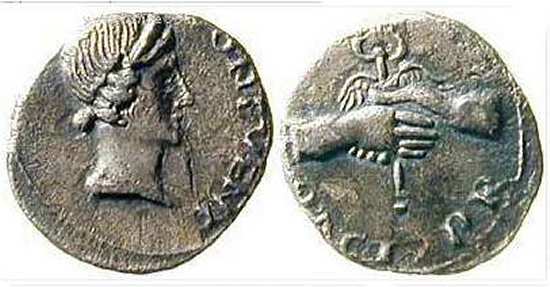 | RIC 4 | Civil war denarius, Spain, April-June 68. BON EVENT Female head right, wearing fillet in hair / PACI PR, clasped hands holding caduceus. BMC 4. RIC 4. | Text | Image |