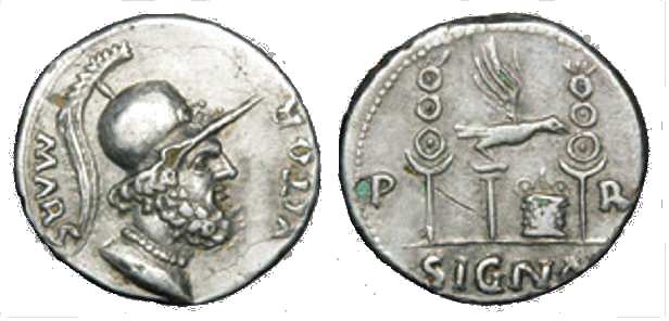 | RIC 51 | Anonymous Roman Civil War Denarius. MARS VLTOR, helmeted bust of bearded Mars right / Eagle standing right on column between two standards with an altar between eagle and standard on right. P-R across fields, SIGNA below. RIC 51; RSC 406; BMCRE 40. | Text | Image |