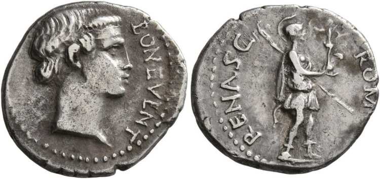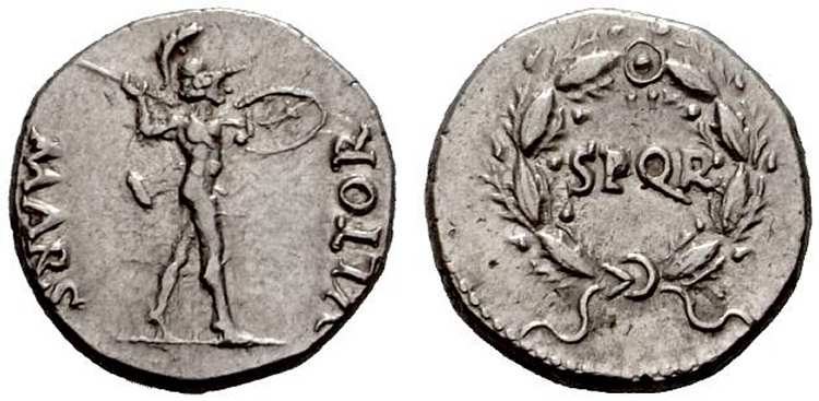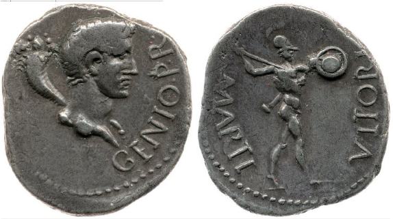 | RIC 17 | Civil Wars, AR Denarius, 3.38 g. Spanish mint. GENIO P R, bare-headed bust of Genius right, cornucopiae behind / MARTI VLTORI, Mars walking right, holding spear in right hand, shield in left hand and parazonium on left side. RIC I 17; BMC 1. | Text | Image |