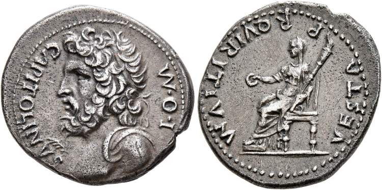 | RIC 125a | Civil War. Anonymous AR denarius. Struck under Vitellian forces in Southern Gaul and the Rhine valley, January-April AD 69. 20 mm, 3.76 g. I O M CAPITOLINVS, diademed, heroic bust of Jupiter Capitolinus left, with draped left shoulder, palm branch beneath chin. / VESTA P R QVIRITIVM, Vesta, veiled, seated left, holding patera and torch. RIC I 125a; BMCRE 72; RSC 432; Gollnow coll. 125.1 (this coin). | Text | Image |