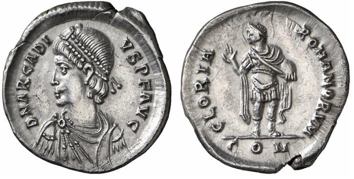 | Milan RIC IX 32b | Arcadius AR Siliqua. 395-402 AD. D N ARCADIVS P F AVG, pearl-diademed, draped and cuirassed bust right / VIRTVS ROMANORVM, Roma seated left on cuirass with Victory on globe and spear (or sceptre, not in RIC but well known type). Mintmark MDPS. RSC 27b; Sear 20762 note. | Text | Image | |