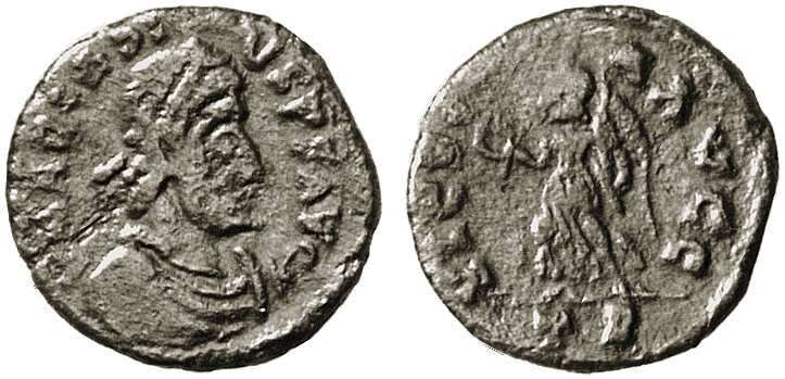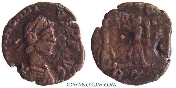 | Heraclea RIC IX 24c | Arcadius AE3. D N ARCADIVS P F AVG, pearl-diademed, draped and cuirassed bust right / VIRTVS EXERCITI, emperor standing right, holding labarum and globe, left foot on captive, sometimes with star to left. Mintmark SMHB or dot SMHB. | Text Text | Image Image | |
