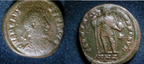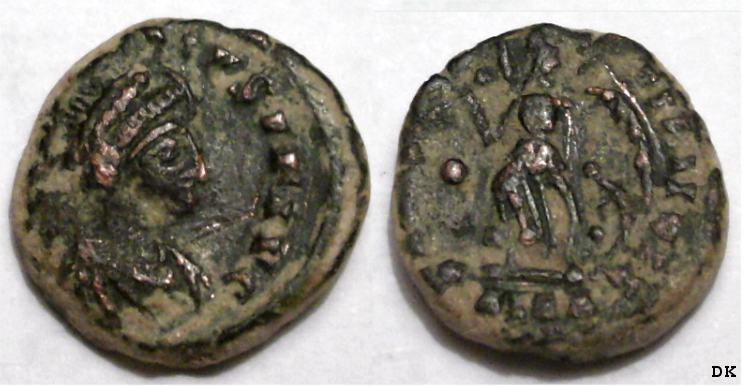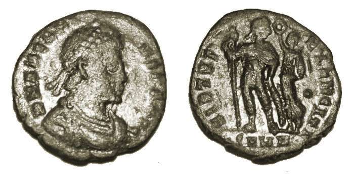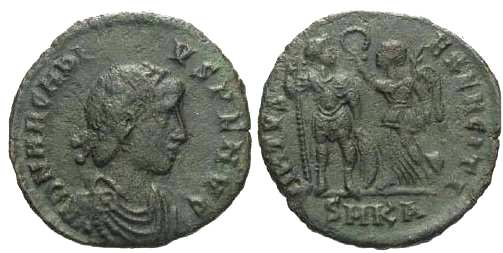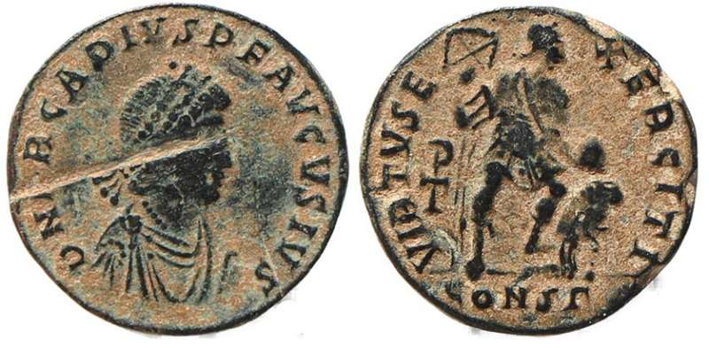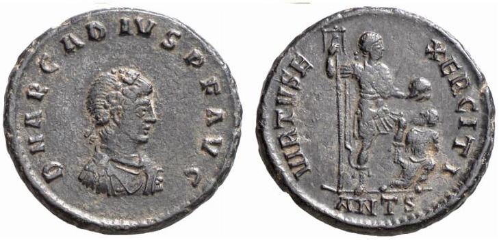 | Antioch RIC X 70, B | Arcadius AE4 of Antioch. AD 395-401. DN ARCADIVS PF AVG, pearl-diademed, draped, cuirassed bust right / VIRTVS-EXERCITI, emperor standing left, head right, holding spear and resting left hand on shield. Victory, standing beside him crowns him with a wreath held in her right hand. Mintmark ANTB. RIC X 70; Sear 20832. | Text | Image | |