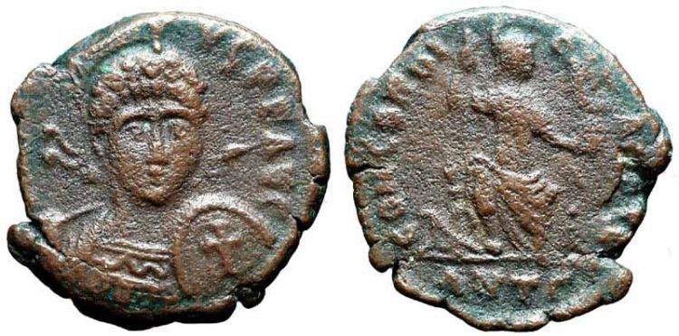 | Antioch RIC X 70, A | Arcadius AE4 of Antioch. AD 395-401. DN ARCADIVS PF AVG, pearl-diademed, draped, cuirassed bust right / VIRTVS-EXERCITI, emperor standing left, head right, holding spear and resting left hand on shield. Victory, standing beside him crowns him with a wreath held in her right hand. Mintmark ANTA. RIC X 70; Sear 20832. | Text | Image | |