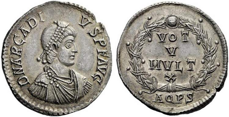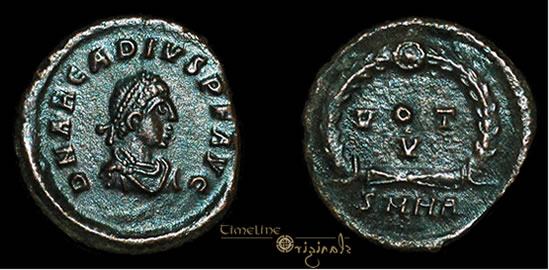 | Constantinople RIC IX 62b | Arcadius AE 4. D N ARCADIVS P F AVG, pearl-diademed, draped and cuirassed bust right / VOT V in wreath. Mintmark CONΓ. | Text | Image | |
