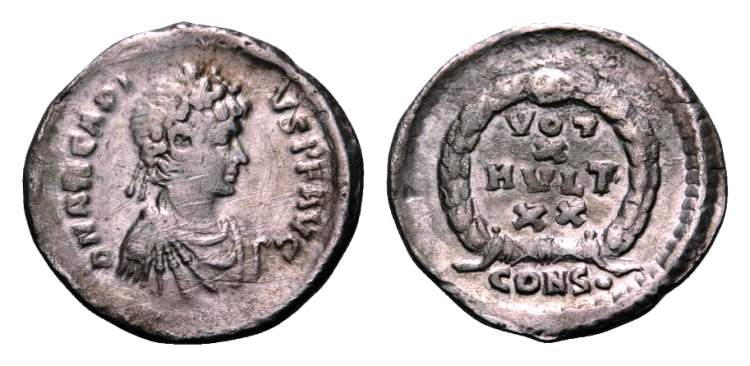 | Antioch RIC IX 65c | Arcadius AE 4. 383-388 AD. D N ARCADIVS P F AVG, pearl-diademed and draped bust right / VOT X MVLT XX in wreath. Mintmark ANΔ. | Text | Image | |