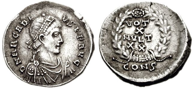 | Constantinople RIC IX 77e | Arcadius, AR siliqua, Constantinople. AD 392-395. 17mm, 2.02 g. DN ARCADI-VS PF AVG, pearl diademed, draped, cuirassed bust right / VOT X MVLT XX in four lines within wreath. Mintmark CONS dot. RIC IX Constantinople 77e; RSC 28Ac; Sear 20771. | Text | Image | |