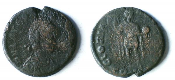 | Antioch RIC IX 97 | Arcadius AE3. DN ARCADI-VS PF AVG, helmeted bust facing, spear across shoulder, holding shield decorated with cross / CONCORDIA AVGG, Constantinopolis enthroned facing, foot on prow, head right, holding sceptre and Victory on globe. Mintmark ANTΓ. | Text Text | Image Image | |