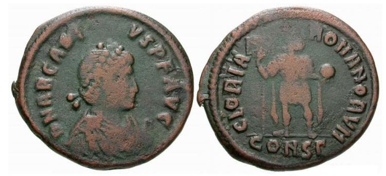 | Constantinople RIC X 85 | Arcadius AE3. Constantinople, 401-403 AD. D N ARCADIVS P F AVG, helmeted, diademed, cuirassed, facing bus with spear across right shoulder and shield slung around back of left shoulder / CONCORDIA AVGG, Constantinopolis seated with head right, holding Victory on a globe and sceptre; right foot set upon the stern of a galley. Mintmark CONSΓ. LRBC 2210. | Text | Image | |