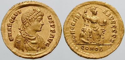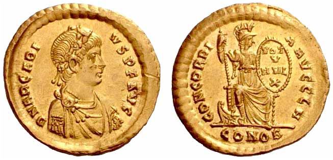 | Constantinople RIC X 7, E | Arcadius AV Solidus. Constantinople mint, 397-402 AD. D N ARCADI-VS P F AVG, three-quarter facing bust, holding spear over shoulder and shield decorated with horseman / CONCORDI-A AVGGE, Constantinopolis enthroned with sceptre and Victory on globe. Mintmark CONOB. Sear 20706. | Text | Image | |
