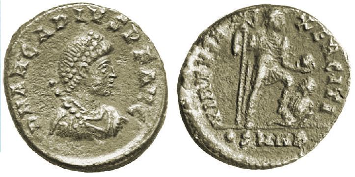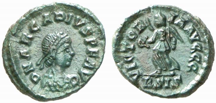 | Siscia RIC IX 39c, A | Arcadius AE4. DN ARCADIVS PF AVG, pearl-diademed, draped and cuirassed bust right / VICTORIA AVGGG, Victory walking left, holding wreath and palm. Mintmark ASIS. RIC IX Siscia 39c; Sear 20864. (Note: no legend break). | Text | Image | |