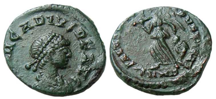 | Lyons RIC IX 44d, P | Arcadius, AE4, Lyons. DN ARCADIVS PF AVG, pearl diademed, draped, cuirassed bust right / VICTOR-IA AVGGG, Victory walking left, holding wreath and palm. Mintmark LVGP. RIC IX Lyons 44d. | Text | Image | |