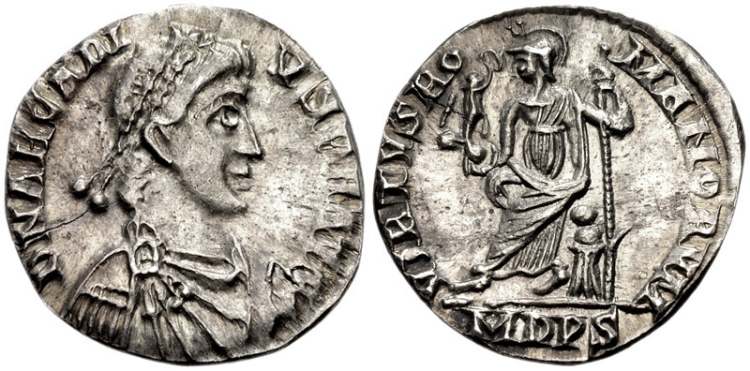 | Milan RIC X 1227 | Arcadius, AR light siliqua, Milan mint. 395-423. 15mm, 0.95 g. DN ARCADI-VS PF AVG, pearl diademed, draped, cuirassed bust right / VIRTVS RO-MANORVM, Roma seated left on cuirass, holding Victory (with wreath and palm branch over shoulder) on globe and inverted spear with spur. Mintmark MDPS. RIC X 1227; cf Sear 20762 (as full siliqua); Gussage All Saints Hoard (PAS: DOR-A1CCB1; NC 171, 54). | Text Text | Image Image | |
