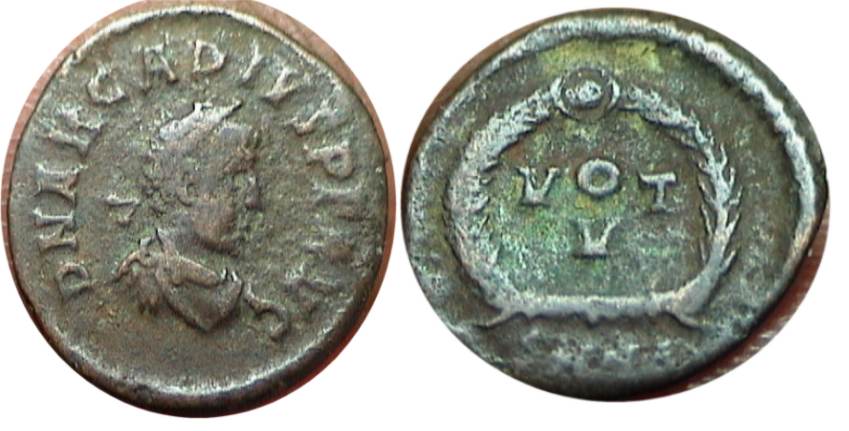 | Constantinople RIC IX 62b var | Arcadius, AE4, Constantinople. 383-408 AD. DN ARCADIVS PF AVG, pearl-diademed, draped, cuirassed bust right / VOT V within wreath. Mintmark CON. RIC IX Constantinople 62b var (no officina letter). | Text | Image | |
