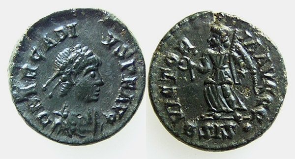 Antioch RIC X 70, Γ | Arcadius AE4. Antioch. D N ARCADI-VS P F AVG, pearl-diademed, draped, cuirassed bust right / VIRTVS-EXERCITI, emperor standing left, head right, holding spear and resting left hand on shield. Victory, standing beside him crowns him with a wreath which she holds in her right hand. Mintmark ANTΓ. | Text | Image | |