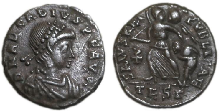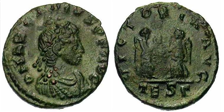 | Thessalonica RIC IX 61c | Arcadius, AE3, Thessalonica. DN ARCAD-IVS PF AVG, pearl diademed, draped, cuirassed bust right / VIRTVS-AVGGG, emperor standing left, head right, on galley, holding phoenix on globe and standard, and spurning a captive with his right foot; Victory at the helm. Γ in left field. Mintmark TES. RIC IX Thessalonica 61c. | Text | Image | |