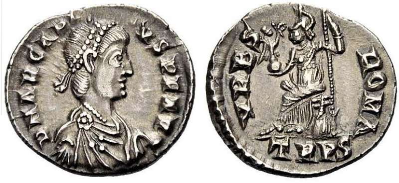 | Lyons RIC IX 43c | Arcadius AR Siliqua, Lyons. DN ARCADI-VS PF AVG, pearl diademed, draped, cuirassed bust right / VRBS-ROMA, Roma seated left on cuirass, holding Victory and inverted spear. Mintmark LVGPS. RIC IX Lyons 43c; Sear 20759. | Text | Image | |
