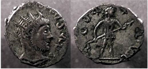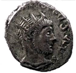 | RIC p592 | Quintus Bonosus c. 280 AD, billon antoninianus. M C BONOS AVI (?) Radiate & draped, bearded bust right / IOVL X AIVN Emperor, holding transverse spear, standing facing, head right. | Text | Image |