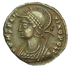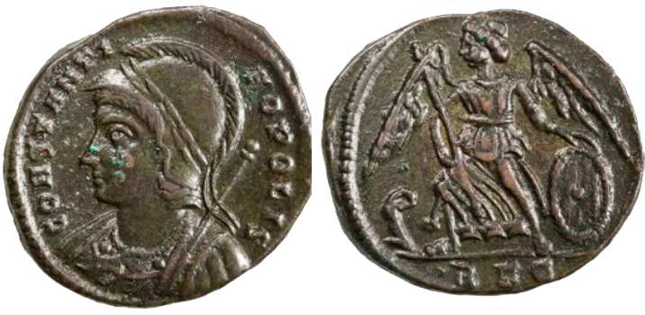 Thessalonica RIC VII 230,Δ | City Commemorative AE follis (over 20mm). 336-337 AD. CONSTAN-TINOPOLIS, laureate, helmeted bust of Constantinople left in imperial mantle, sceptre over left shoulder / Victory standing facing on prow, head left, sceptre in right hand, left hand on shield. Mintmark SMTSΔ. | Text | Image |