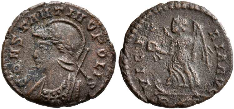 Arles RIC VII 369 | Constantinopolis Commemorative AE Follis. 332-333 AD. CONSTANTINOPOLIS, laureate, helmeted and mantled bust left holding sceptre / Victory standing front, looking left, foot on prow, holding transverse sceptre and leaning on shield; three-branched palm branch in left field. Mintmark PCONST. RIC VII Arles 369; Sear 16454. | Text | Image |