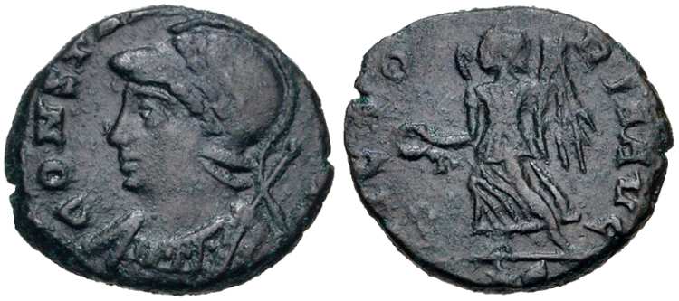 Aquileia RIC VII 123, P | City Commemorative, AE Follis. Struck AD 334-335. Aquileia. 2.12 g. CONSTAN-TINOPOLIS, laureate helmeted bust of Constantinopolis left, wearing imperial mantle and holding sceptre over shoulder / No legend, Victory standing facing, head left, holding transverse sceptre and resting hand on shield. Mintmark AQP. RIC VII Aquileia 123; Sear 16460. | Text | Image |