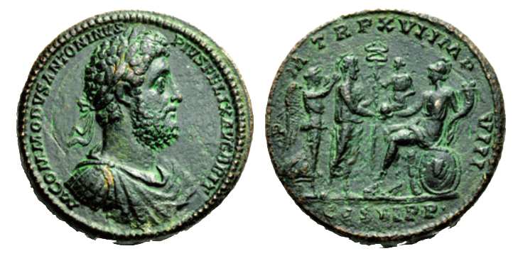 | Gnecchi 108 | Commodus, AE medallion, AD 192. 95.47 g (!). M COMMODVS ANTONINVS PIVS FELIX AVG BRIT, laureate, draped and cuirassed bust right. / PM TR P XVI IMP VIII, Roma seated left on cuirass, holding cornucopiae and presenting globe to Commodus standing right, crowned by Victory behind him. In the background, Felicitas standing left, holding caduceus. COS VI PP in exergue. Gnecchi 108; Cohen 562. | Text | Image |