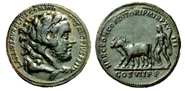 | Gnecchi 23 | Commodus, AE medallion, AD 192. 95.47 g (!). L AELIVS AVRELIVS COMMODVS AVG PIVS FELIX, head right wearing lionskin headdress. / HERC ROM CONDITORI P M TR P XVIII, Commodus as Hercules walking left, holding club and guiding a yoke of oxen. COS VII P P in exergue. Gnecchi 23; BMC Roman medallions 42. | Text | Image |