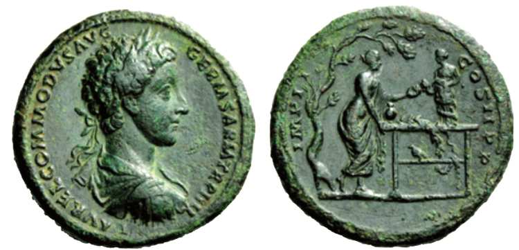 | Gnecchi 38 | Commodus, AE medallion, AD 179. 47 g. L AVREL COMMODVS AVG GERM SARM TR P III, laureate, draped and cuirassed bust right. / IMP II COS II P P, woman standing right beneath a tree, leaning with right hand on table upon which are placed a vase, a laurel-garland and a figure of Salus feeding a serpent, a raven on the cross-bar of the table. Gnecchi 38; BMC Roman medallions 4; Cohen 225. | Text | Image |