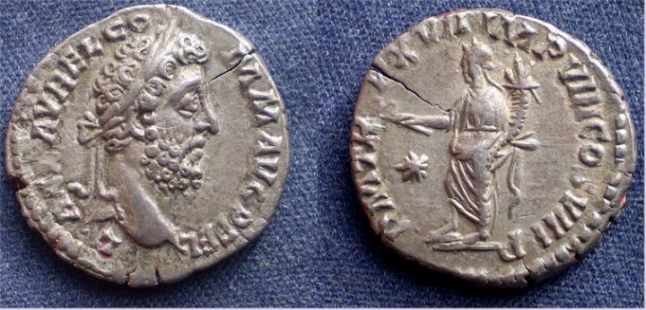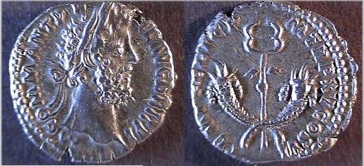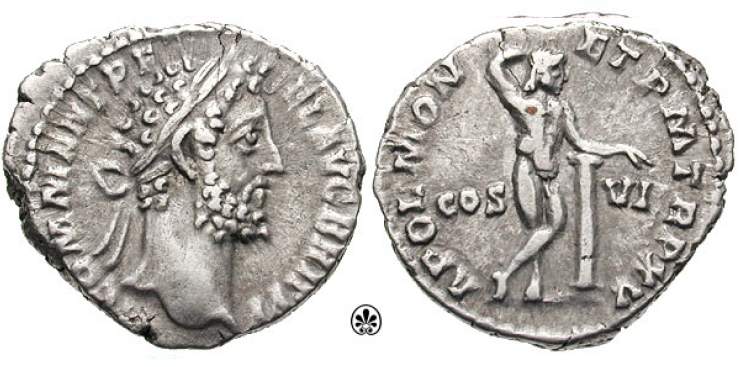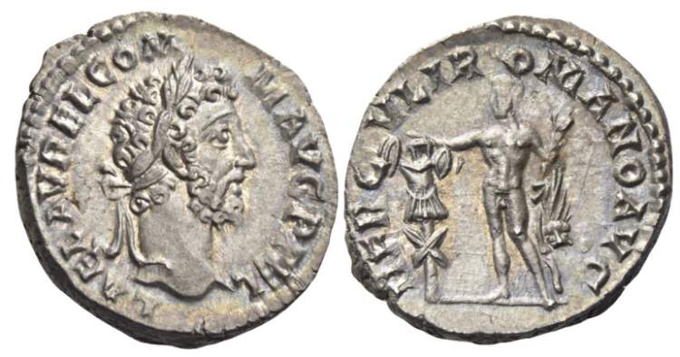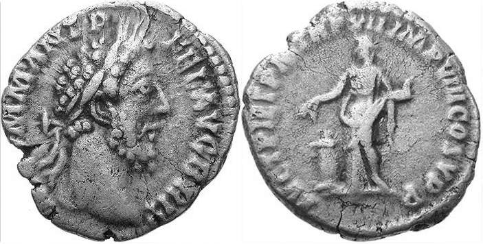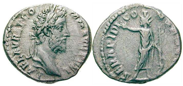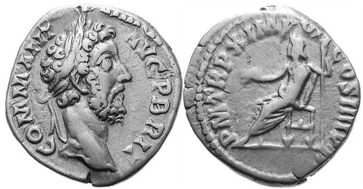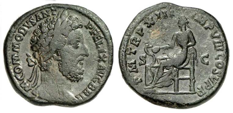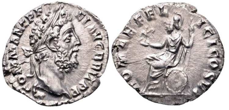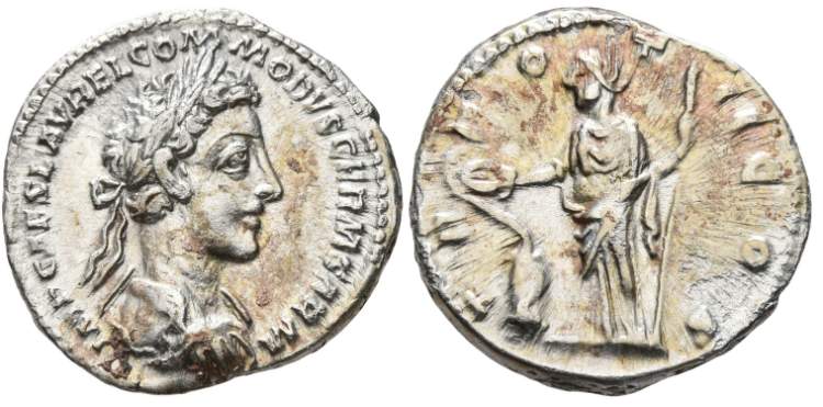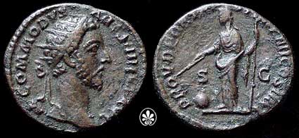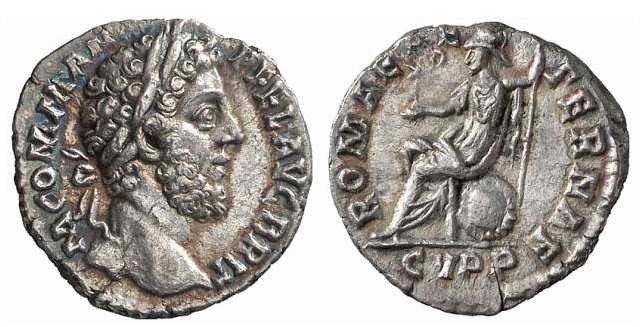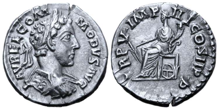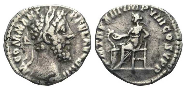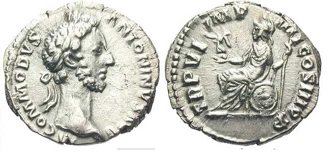 | RIC 662[aurelius] | Commodus Denarius. 179 AD, struck under Marcus Aurelius. L AVREL COMMODVS AVG, laureate head right / TR P IIII IMP II COS II P P, Fortuna seated left, holding rudder and cornucopiae; wheel under seat. RIC 662; RSC 771. | Text | Image |