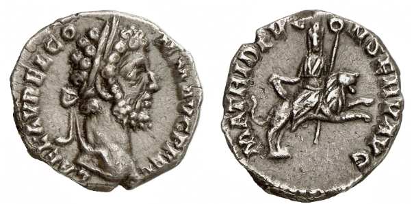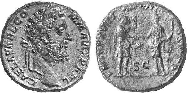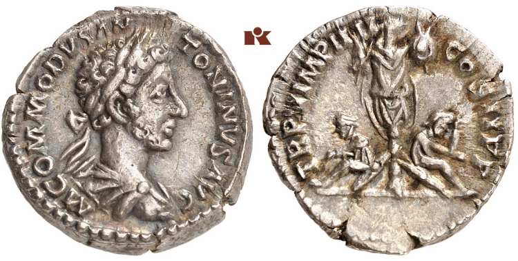 | RIC 609[aurelius] | Commodus, as Caesar, Denarius. 175-176 AD. COMMODO CAES AVG FIL GERM SARM, draped bust right / DE SAR-MATIS, two captives, male and female, seated below trophy. RSC 93a. | Text | Image |