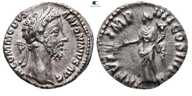 | RIC 15 | Commodus Denarius. M COMMODVS ANTONINVS AVG, laureate head right / TR P VI IMP IIII COS III PP, Felicitas standing left, holding short caduceus and sceptre. RIC 15; RSC 805. | Text | Image |