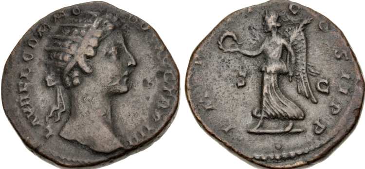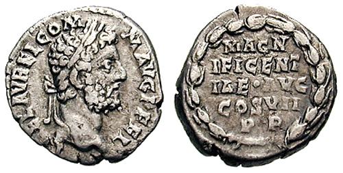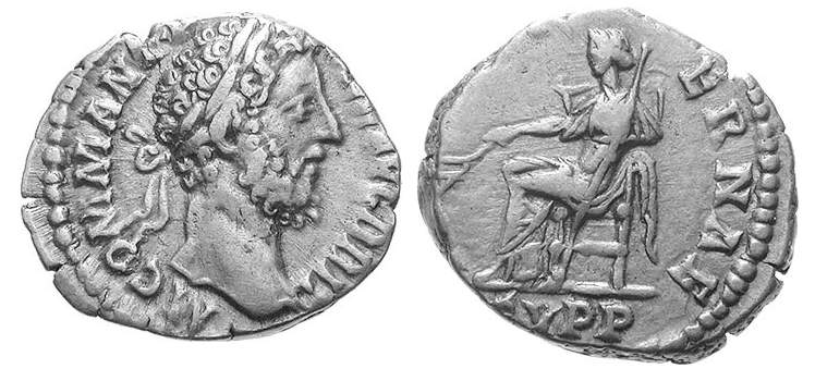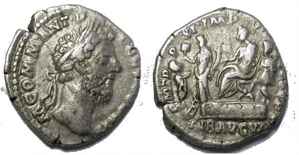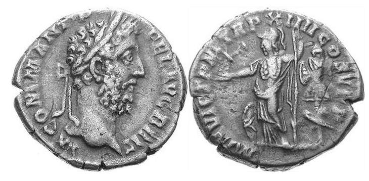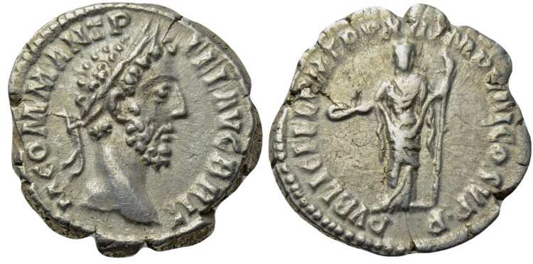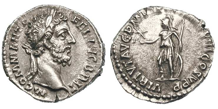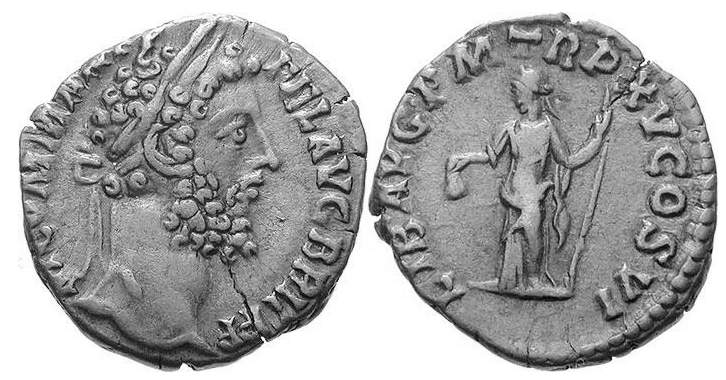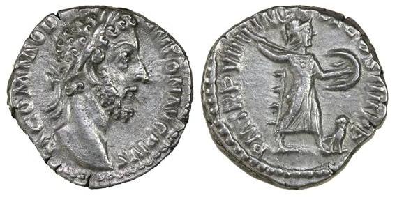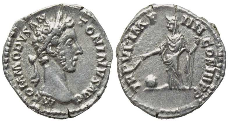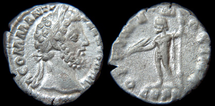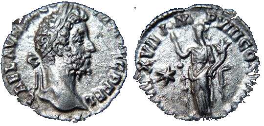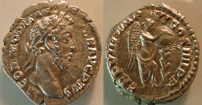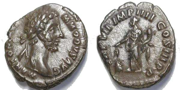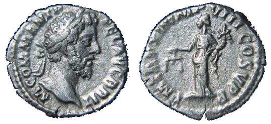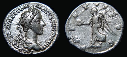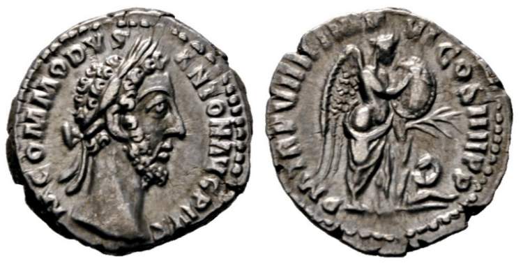 | RIC 664[aurelius] | Commodus, as Caesar, Denarius. L AVREL COMMODVS AVG, laureate head right / TR POT IIII IMP III COS II P P, Victory walking left, holding wreath and palm. RSC 774. | Text | Image |