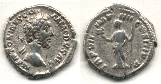 | RIC 14 | Commodus Denarius. 180-181 AD. M ANTONINVS COMMODVS AVG, laureate head right / TR P VI IMP IIII COS III P P, Annona standing left, holding ears of grain over a modius and cornucopiae. RSC 811. | Text | Image |