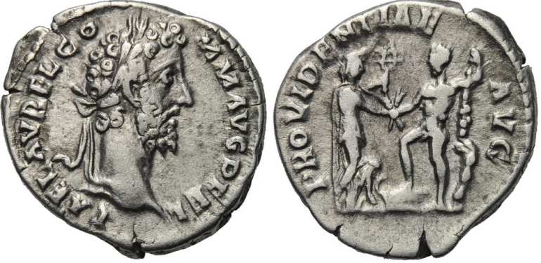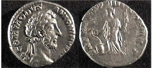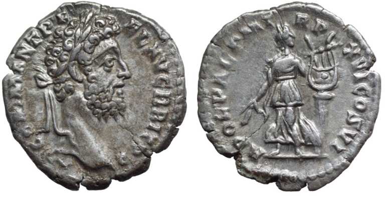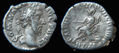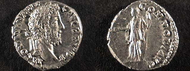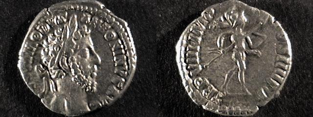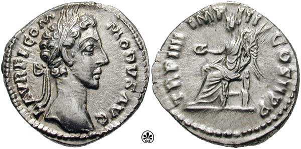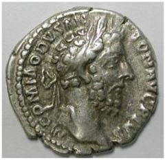 | RIC 661[aurelius] | Commodus AR denarius, struck under Marcus Aurelius, struck AD 179. L AVREL COMMODVS AVG, laureate, cuirassed bust right. / TR P IIII IMP III COS II P P, Fortuna seated left, holding rudder and cornucopiae, wheel beneath the seat. RIC 661; RSC 770a. | Text | Image |