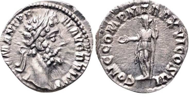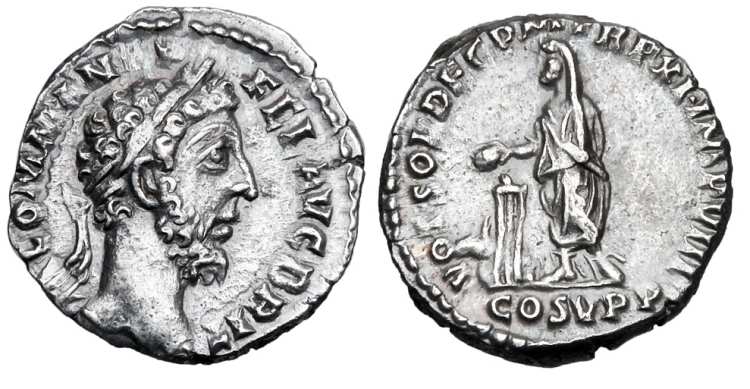 | RIC 654[aurelius] | Commodus as Caesar AD 166-177. AR denarius. AD 177-178. L COMMODVS AVG, laureate, draped bust right / COS P P, Salus, seated left, holding branch over serpent coiling up from ground on left, left arm on side of chair. RIC 654; BMCRE 766; Cohen 66. | Text | Image |