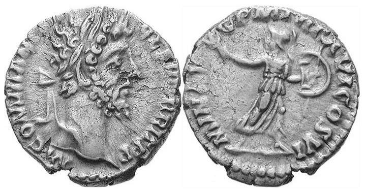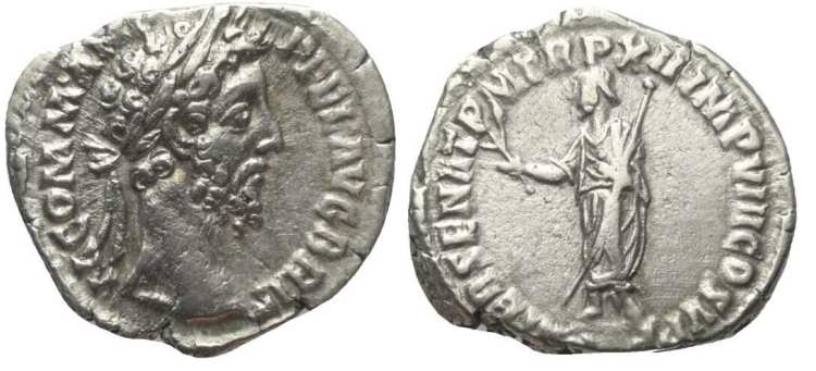 | RIC 652[aurelius] | Commodus Denarius. L COMMODVS AVG, laureate draped bust right / COS P P, Virtus standing left in crested helmet, holding Victory and inverted spear. RSC 63. | Text | Image |