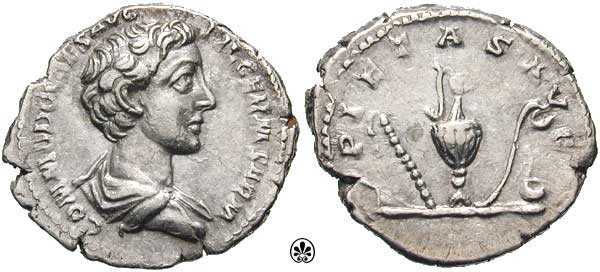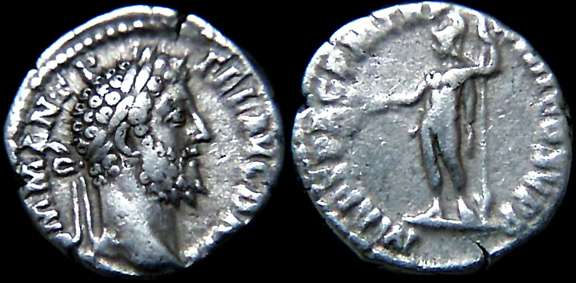 | RIC 621[aurelius] | Commodus, as Caesar, Denarius. Late 175 AD. COMMODO CAES AVG FIL GERM SARM, draped and cuirassed bust right / SPES PVBLICA, Spes standing left, holding flower and drawing out fold of robe. RSC 709a. | Text | Image |