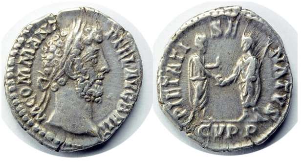 | RIC 1549 [aurelius] | Commodus as Caesar, AE As, 25mm, 9.46 g. Rome mint. Struck under Marcus Aurelius, AD 176. COMMODO CAES AVG FIL GERM SARM COS, bare headed, draped bust right / PRINCIPI IVVENTVTIS, clasped hands holding aquila on prow. S-C across fields. RIC 1549 [aurelius]; Cohen 604; Sear 5563. | Text | Image |