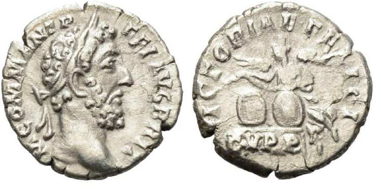 | RIC 628[aurelius] | Commodus, as Caesar, AR Denarius. IMP CAES L AVREL COMMODVS GERM SARM, laureate, draped bust right / TR POT II COS, Victory walking left, holding wreath and palm. RSC 739. | Text | Image |
