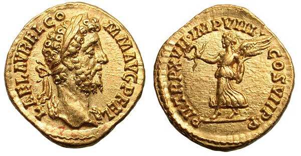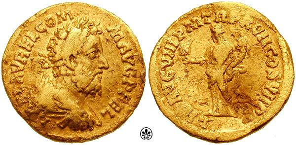 | RIC 3 | Commodus, Rome, AV aureus. AD 179-180. 7.14 g. L AVREL COMMODVS AVG, youthful, laureate, draped bust right. / TR P V IMP III COS II PP, Victory seated left on stool, holding patera and palm branch. RIC 3; Cohen 778; BMC 813 var. (bust type). | Text | Image |