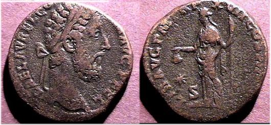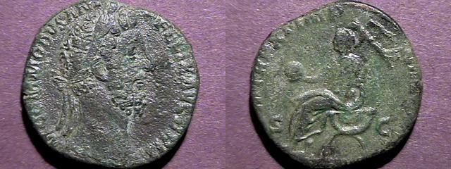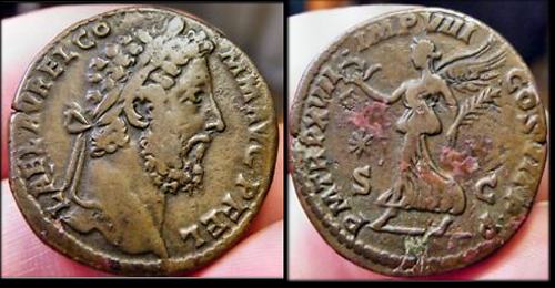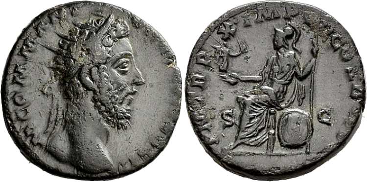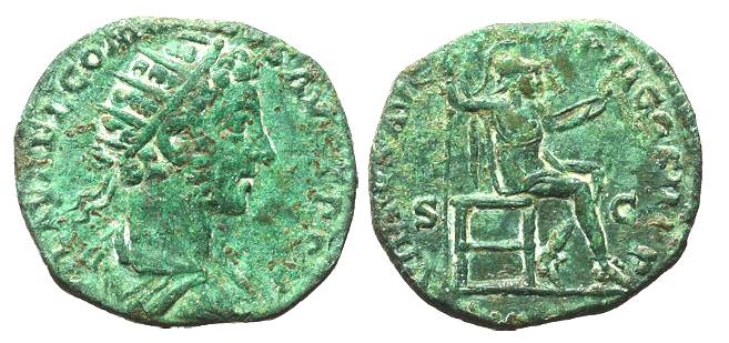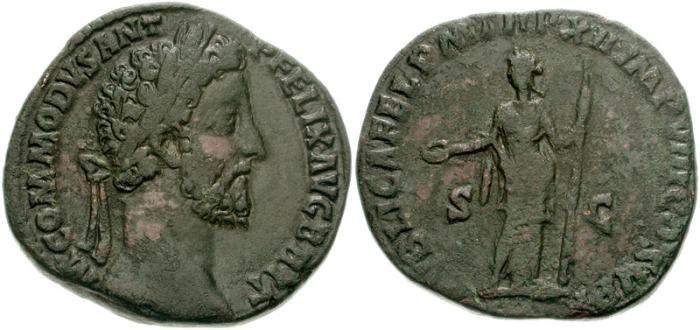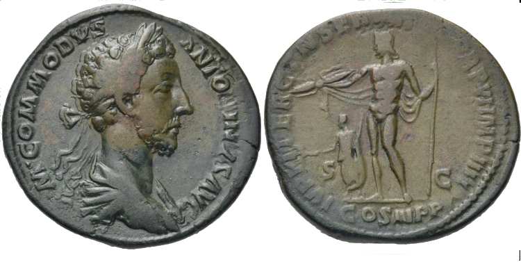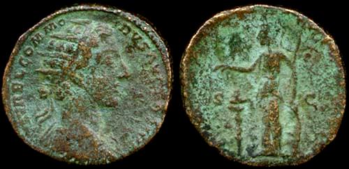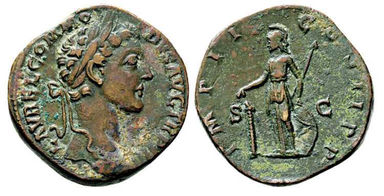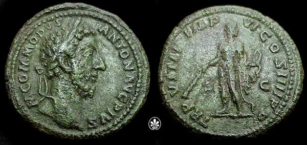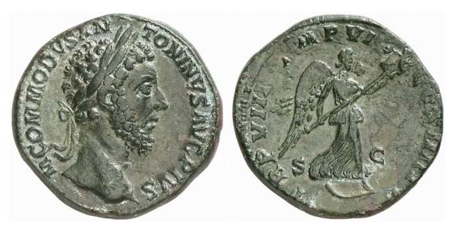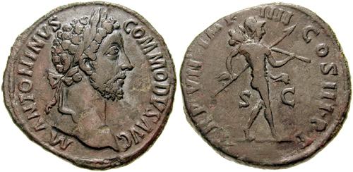 | RIC 1614[aurelius] Sear 5838 | Commodus AE Dupondius. L AVREL COMMODVS AVG TR P IIII, radiate head right / IMP III COS II P P S-C, Victory walking left bearing wreath and palm. Cohen 237. | Text | Image |