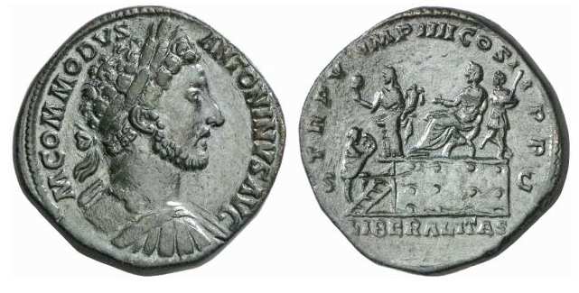 | RIC 1589[aurelius] Sear 5766 | Commodus AE Sestertius. Struck 178 AD. L AVREL COMMODVS AVG TR P III, laureate bust right, drapery on far shoulder / LIBERTAS AVG IMP II COS P P S-C, Libertas standing left, holding pileus and sceptre. | Text | Image |