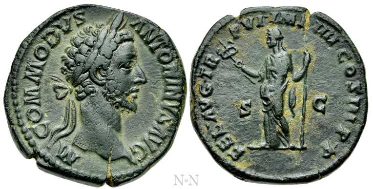 | RIC 1583[aurelius] | Commodus Sestertius. AD 177. L AVREL COMMODVS AVG GERM SARM, laureate, draped and cuirassed bust right, seen from the back. / IVNONI SISPITAE TR P II IMP II COS P P. Juno Sospita, wearing a goatskin cap, walking right on a coiled serpent, holding shield on left arm and brandishing a spear. S-C across fields. RIC III 1583 [aurelius]; Sear 5762; BMCRE 1669. (Note, obverse break can have COMM-, COMMO-, COM- or COMMODVS-). | Text | Image |