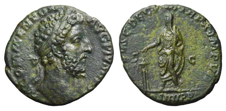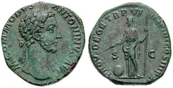 | RIC 1604[aurelius] Sear 5837 | Commodus AE Dupondius. L AVREL COMMODVS AVG TR P IIII, radiate head right / S-C, Minerva standing left, holding sceptre, leaning on shield, sacrificing over altar to left. Cohen 229. | Text | Image |